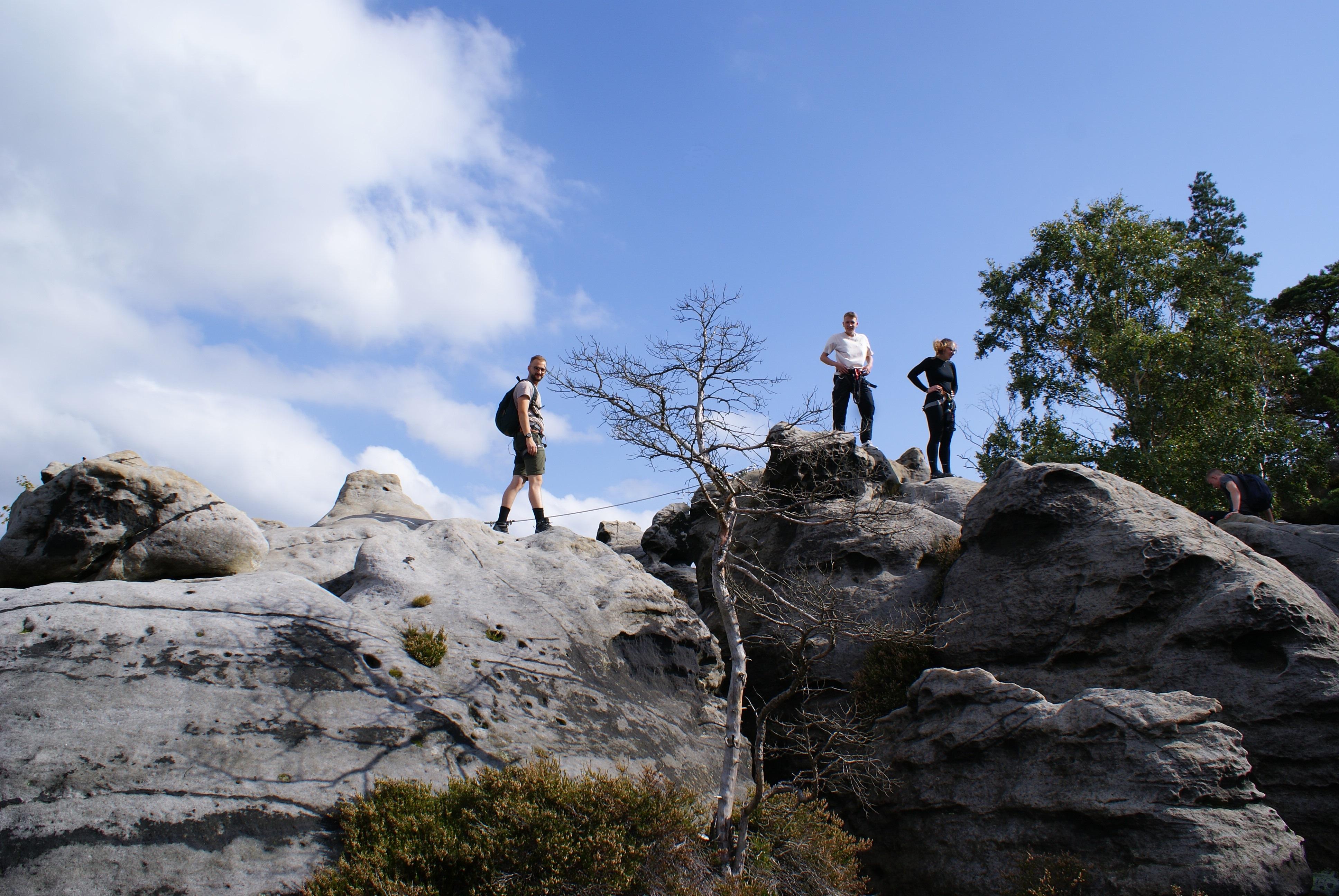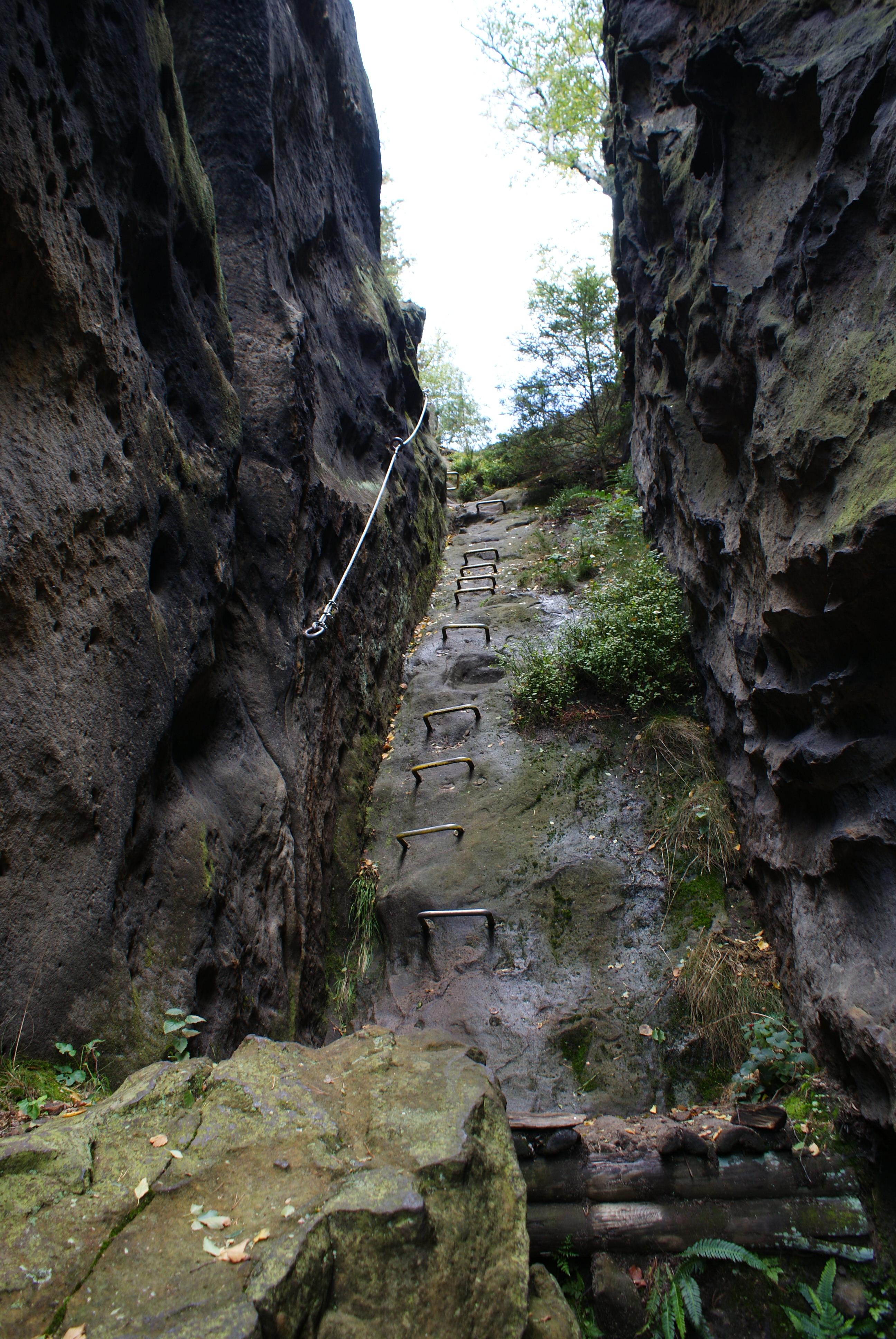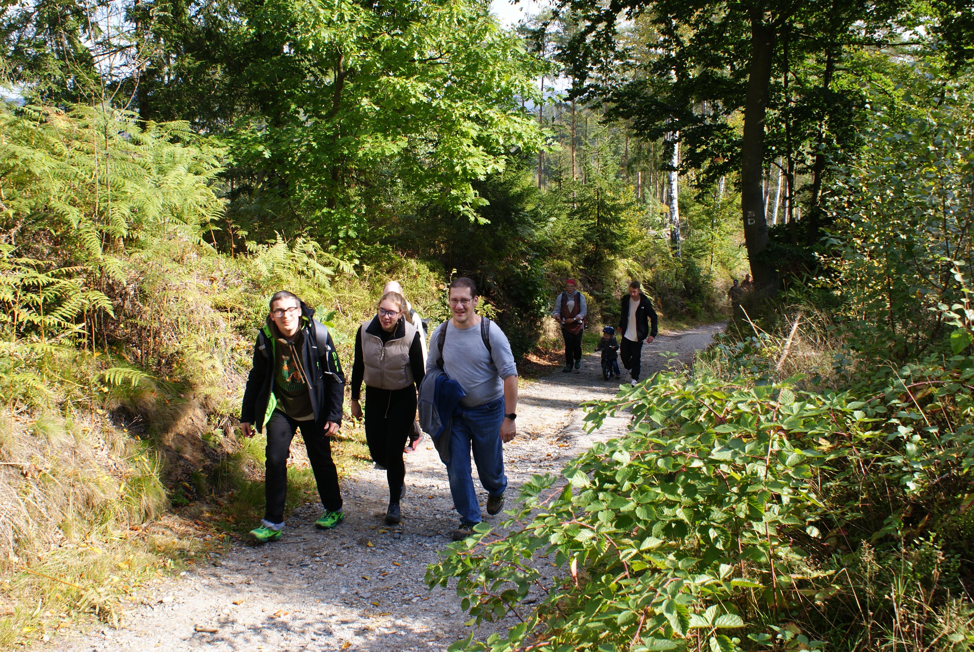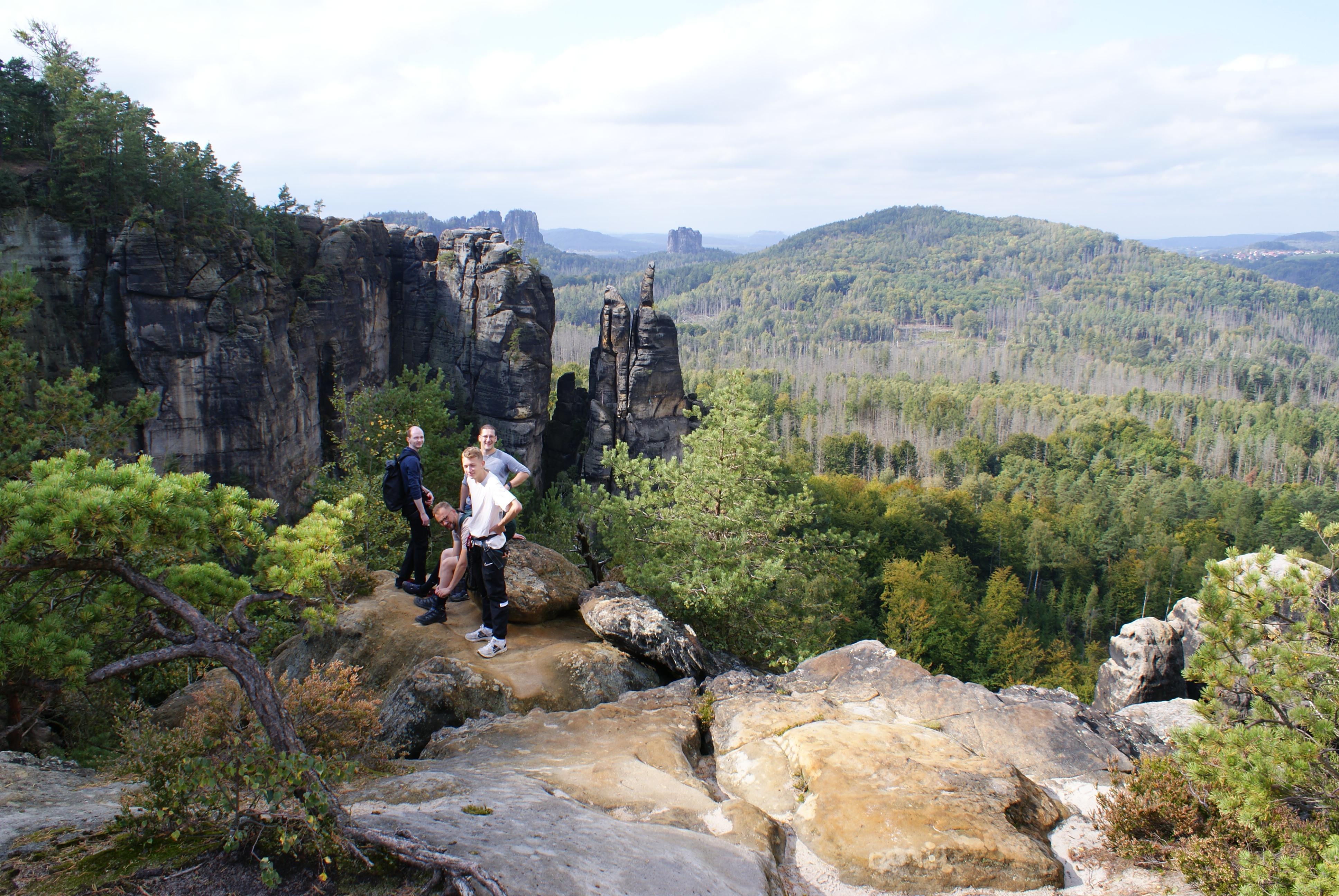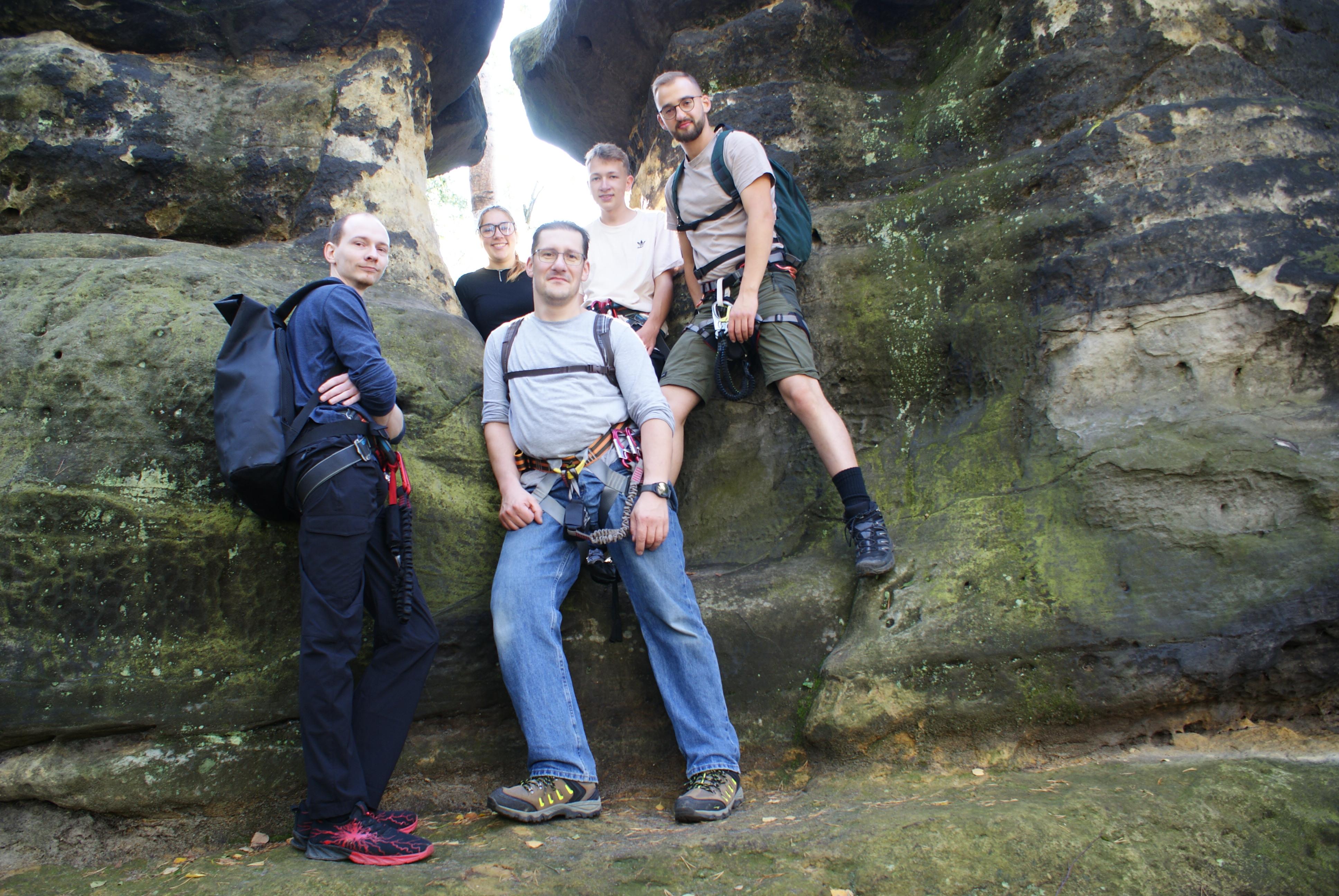 Der Samstag startete mit Nebel, doch schon zum Frühstück hat sich die Sonne gegenüber den Wolken durchgesetzt. Recht warm startete der Tag und alle zusammen fuhren wir mit der Kirtnitzschtalbahn Richtung Beuthenfall. Der kurze Zustieg zum Steig wurde problemlos gemeistert, sodass alle Energie für die Häntzschelstiege übrigblieb. Ausgerüstet mit Klettersets ging es beherzt in die Höhe. Die schöne Aussicht in alle Richtungen des Elbsandsteingebirges nötigte uns einen gehörigen Respekt vor Gottes Schöpfung ab. Stufe für Stufe, Tritt für Tritt haben wir dieses Erlebnis genossen.