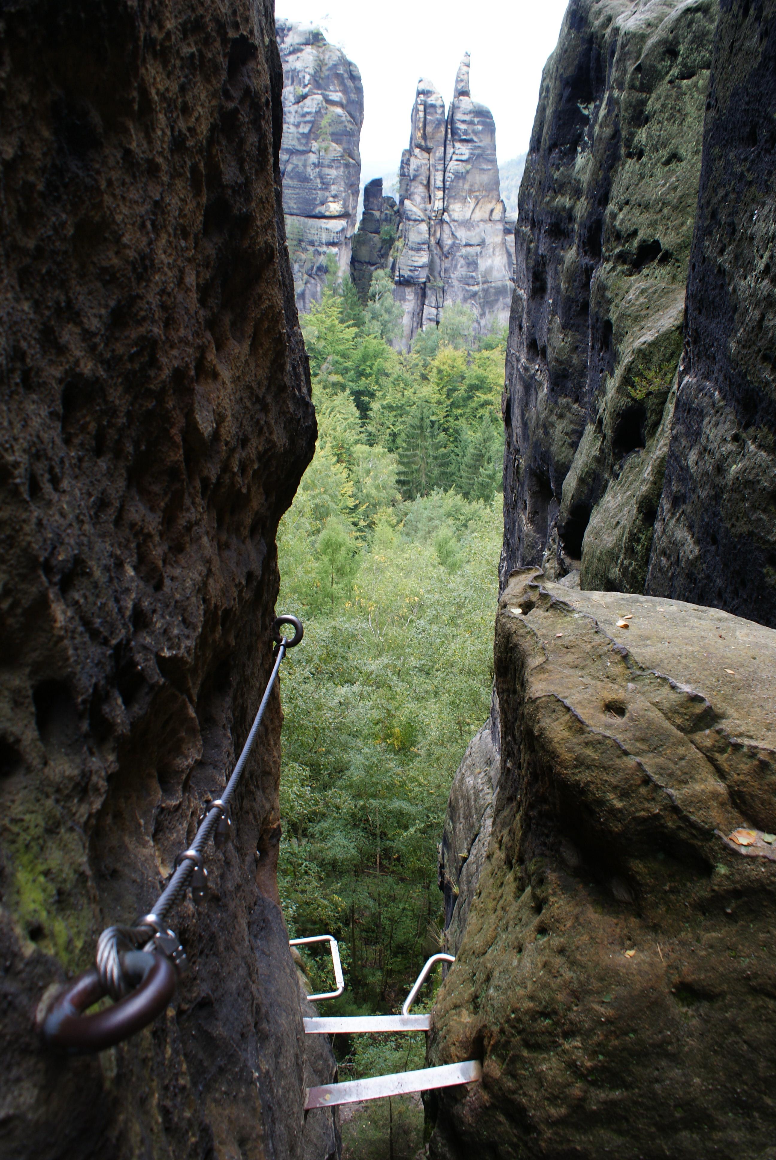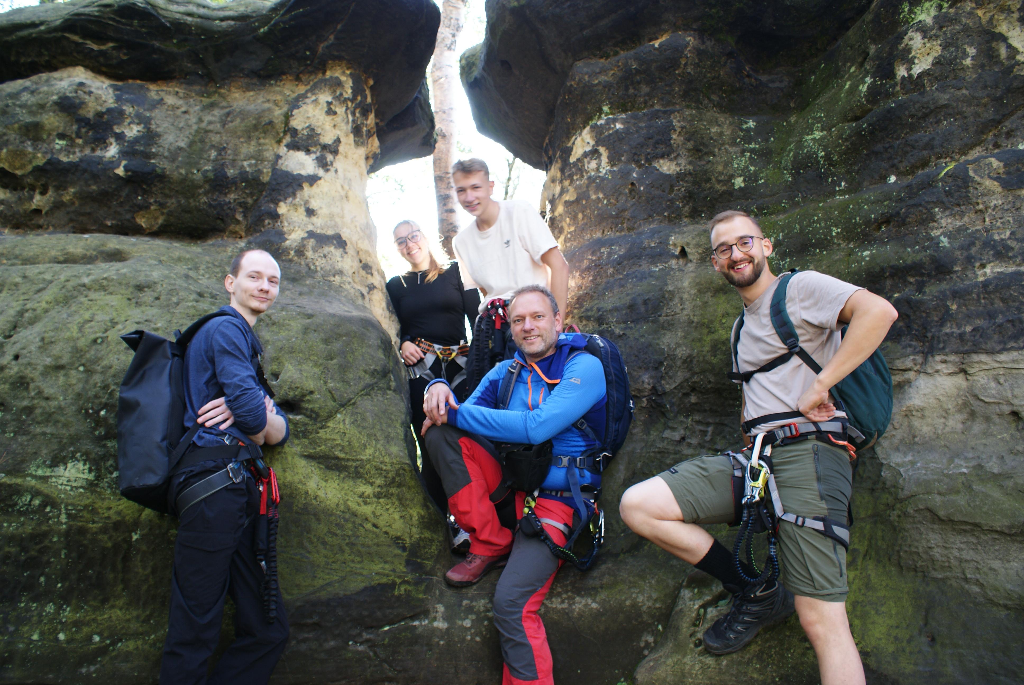 Der Samstag startete mit Nebel, doch schon zum Frühstück hat sich die Sonne gegenüber den Wolken durchgesetzt. Recht warm startete der Tag und alle zusammen fuhren wir mit der Kirtnitzschtalbahn Richtung Beuthenfall. Der kurze Zustieg zum Steig wurde problemlos gemeistert, sodass alle Energie für die Häntzschelstiege übrigblieb. Ausgerüstet mit Klettersets ging es beherzt in die Höhe. Die schöne Aussicht in alle Richtungen des Elbsandsteingebirges nötigte uns einen gehörigen Respekt vor Gottes Schöpfung ab. Stufe für Stufe, Tritt für Tritt haben wir dieses Erlebnis genossen.